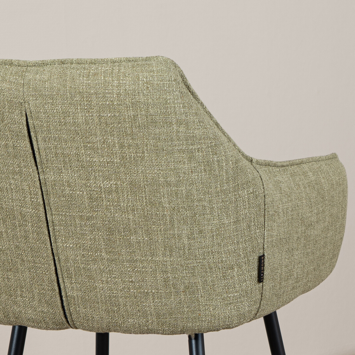 De stof is een polyester stof bestaande uit 85% polyester en 15% linnen. De olijfgroene kleur van de Ciara barkruk geeft een warme en luxe uitstraling aan jouw interieur met een mooie groen kleurige ondertoon. Het zwarte frame in combinatie met de linnen koperen stoffering zorgen voor een harmonieus geheel.