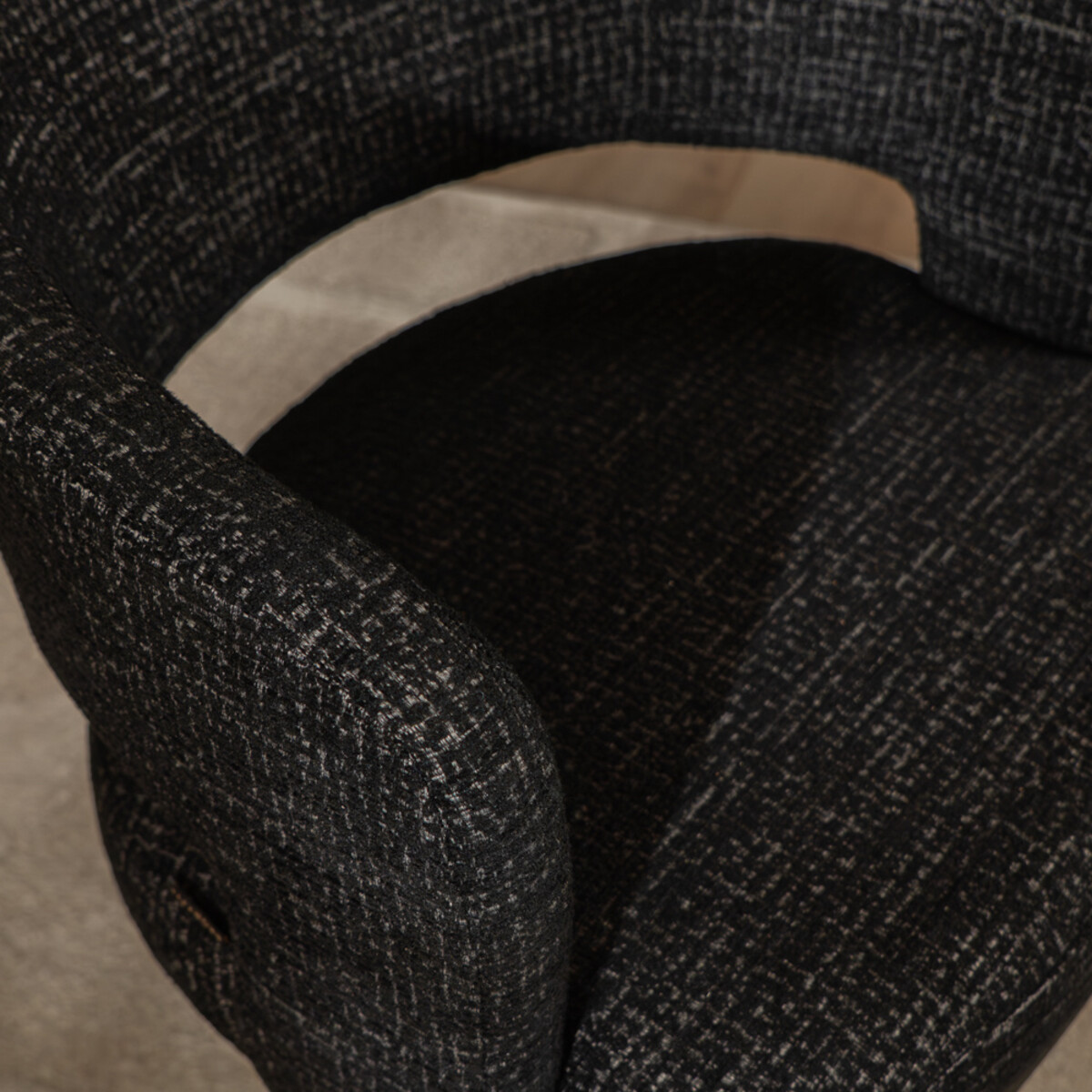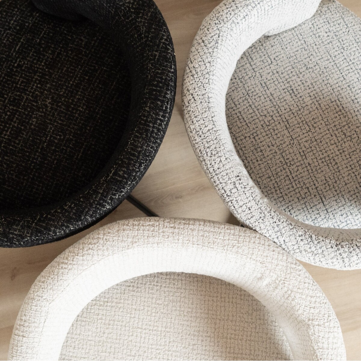De fauteuil is bekleed met een gemêleerde stof die bestaat uit 100% polyester. De stof is geruit, geweven met twee kleuren garen die subtiel met elkaar vermengd zijn. Dit geeft een gemêleerd effect en een verfijnde uitstraling waar je vlekken minder op ziet. De stof is niet waterafstotend dus ons advies is om gebruik te maken van de textiel care kit voor extra bescherming.