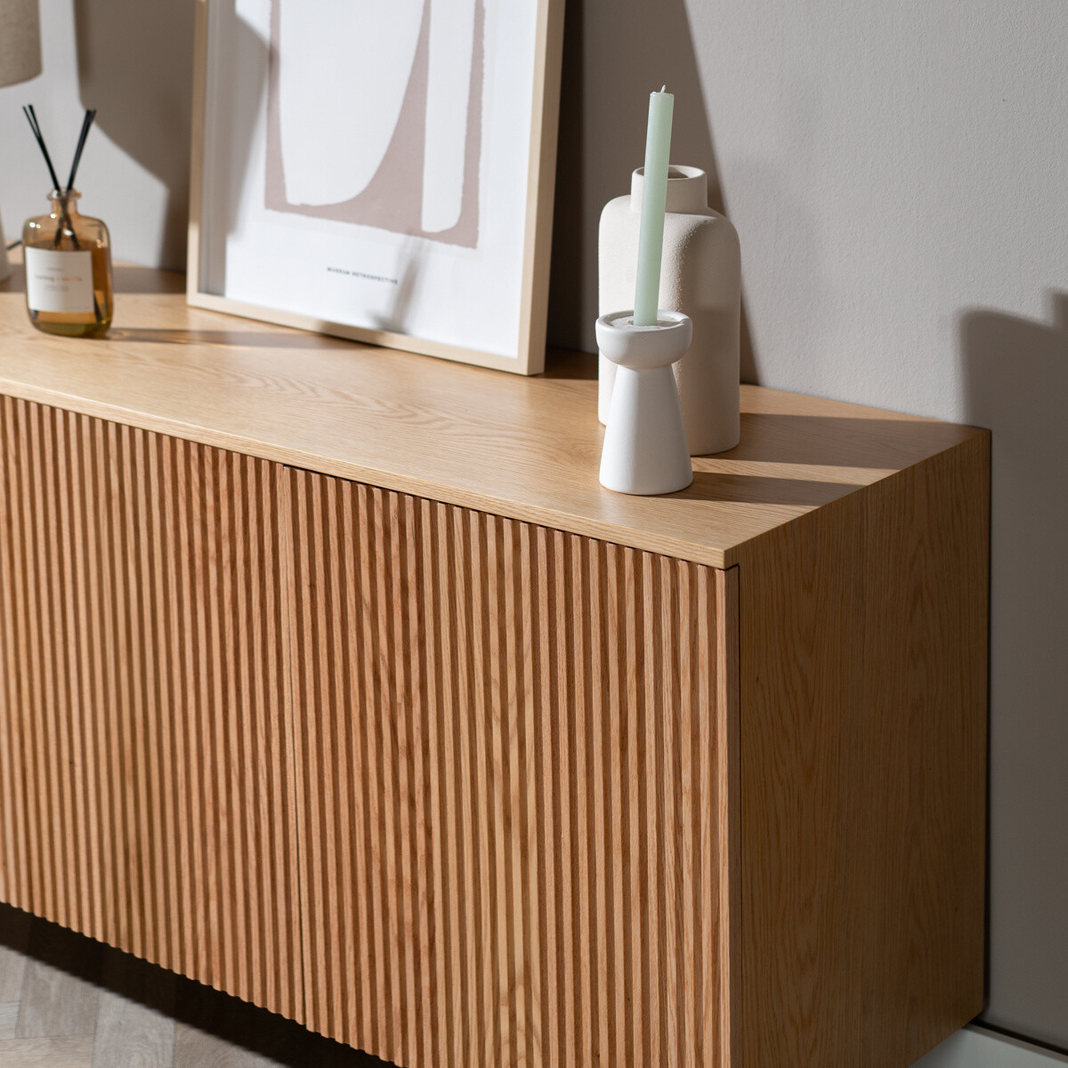 De fronten van de kastdeuren hebben een gestreept design, waardoor het houten dressoir een elegante uitstraling heeft. Het geribbelde design heeft dezelfde look als die van een houten wandpaneel en het meubel is daardoor ook perfect te matchen met deze interieurtrend. Ook zijn de deuren voorzien van een softclose systeem. Een soft close kastdeur kan heel makkelijk geruisloos gesloten worden en zal als deze te hard wordt dichtgedaan niet snel beschadiging aan het meubel veroorzaken.