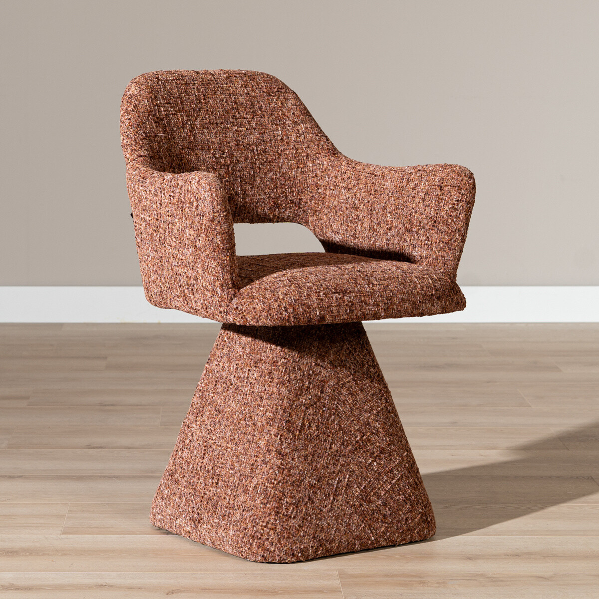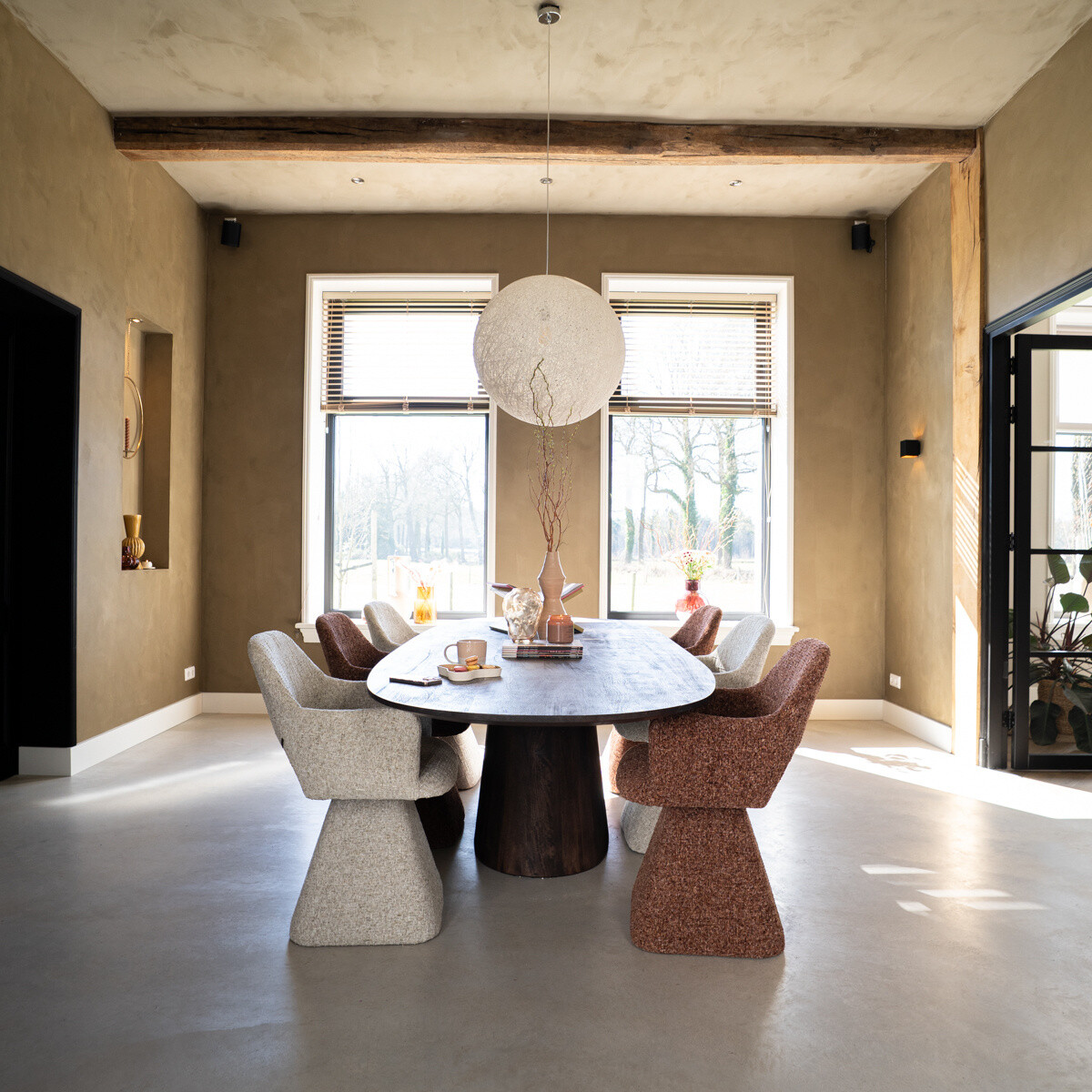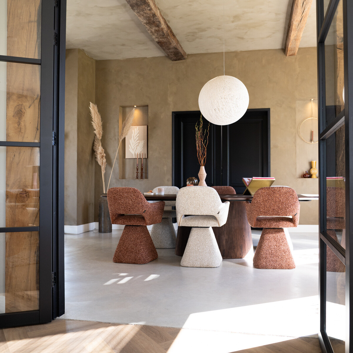 De stoel is bekleed met de stof Cestino. Deze stof is een veelzijdige en duurzame keuze, bestaande uit 95% polyester en 5% katoen, wat zorgt voor een perfecte balans tussen sterkte en zachtheid. De stof is waterafstotend en dus makkelijk schoon te maken. Het unieke aan de Josh stoel is dat de poot gestoffeerd is, de stoel wordt hierdoor een statement in ieder interieur.