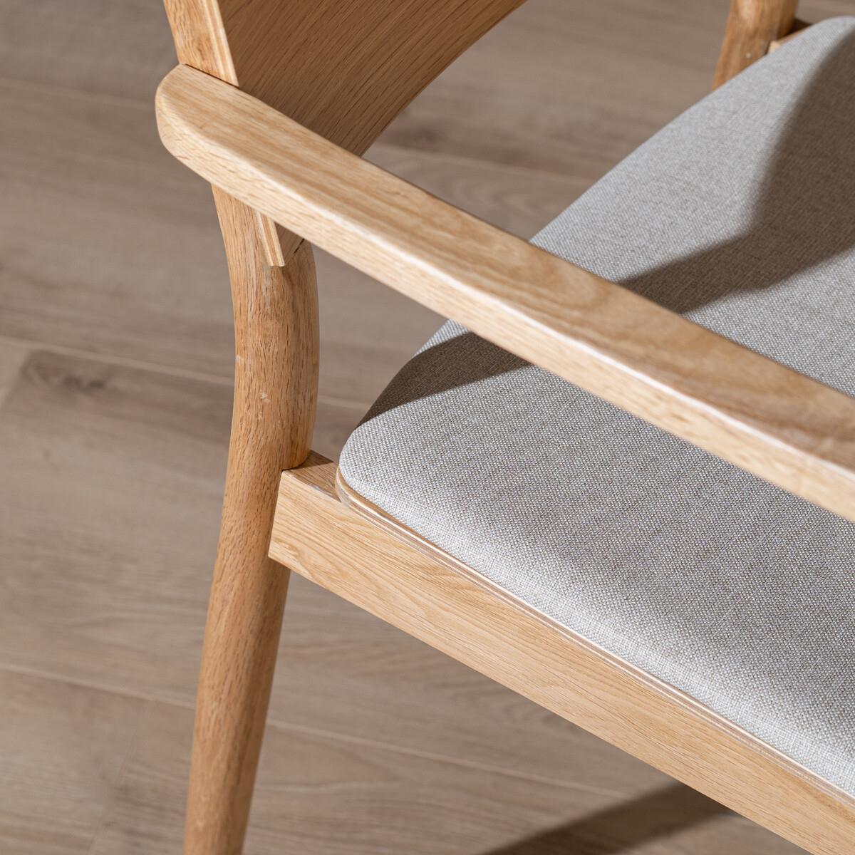 Eetkamerstoel Juan in naturel eiken brengt eenvoud en warmte samen. Juan heeft een minimalistisch design en de strakke lijnen en armleuningen maken de stoel eenvoudig en toch uitnodigend. De zitting heeft een gestoffeerd kussen van linnen stof met een off white kleur wat gemakkelijk te combineren is met andere kleuren in jouw interieur.