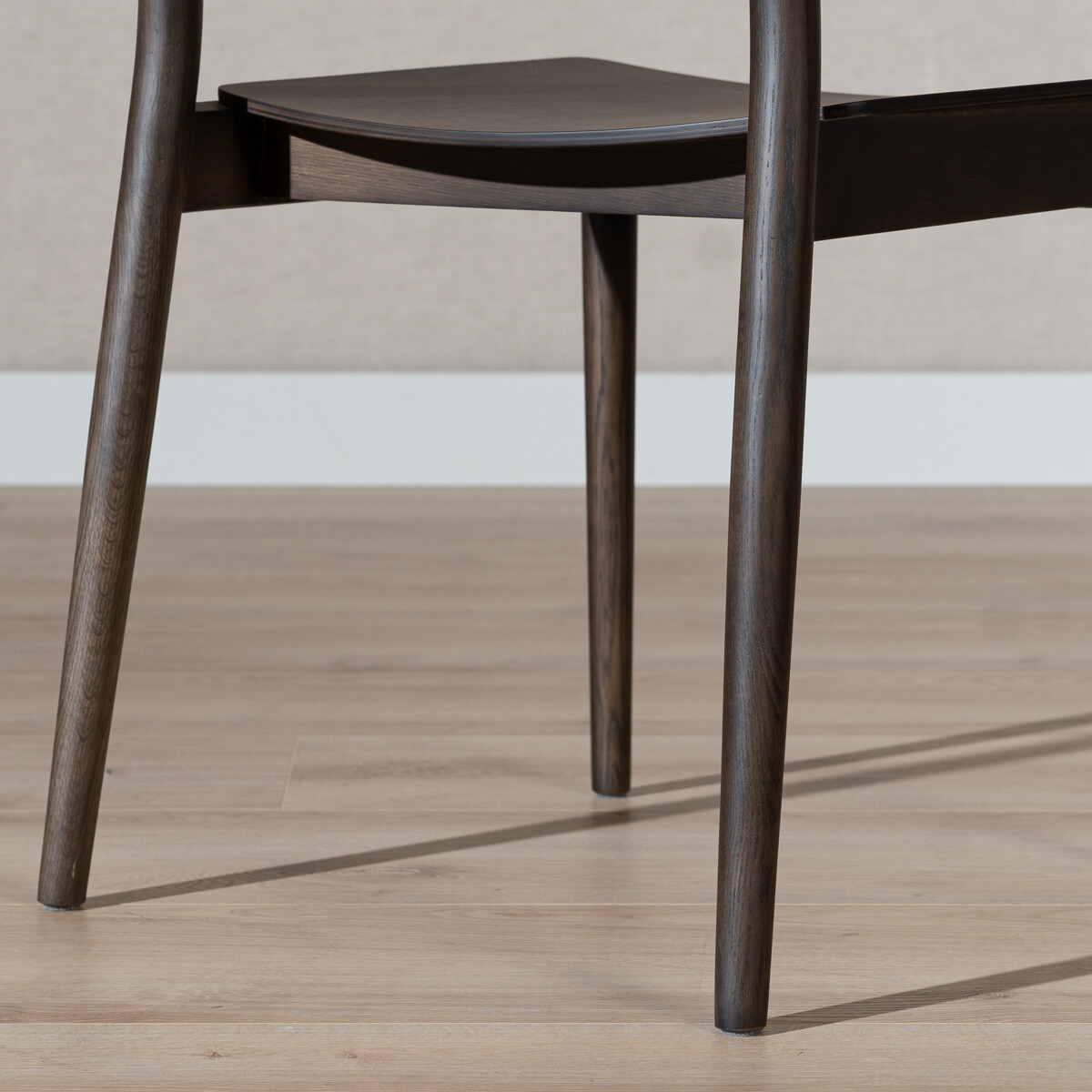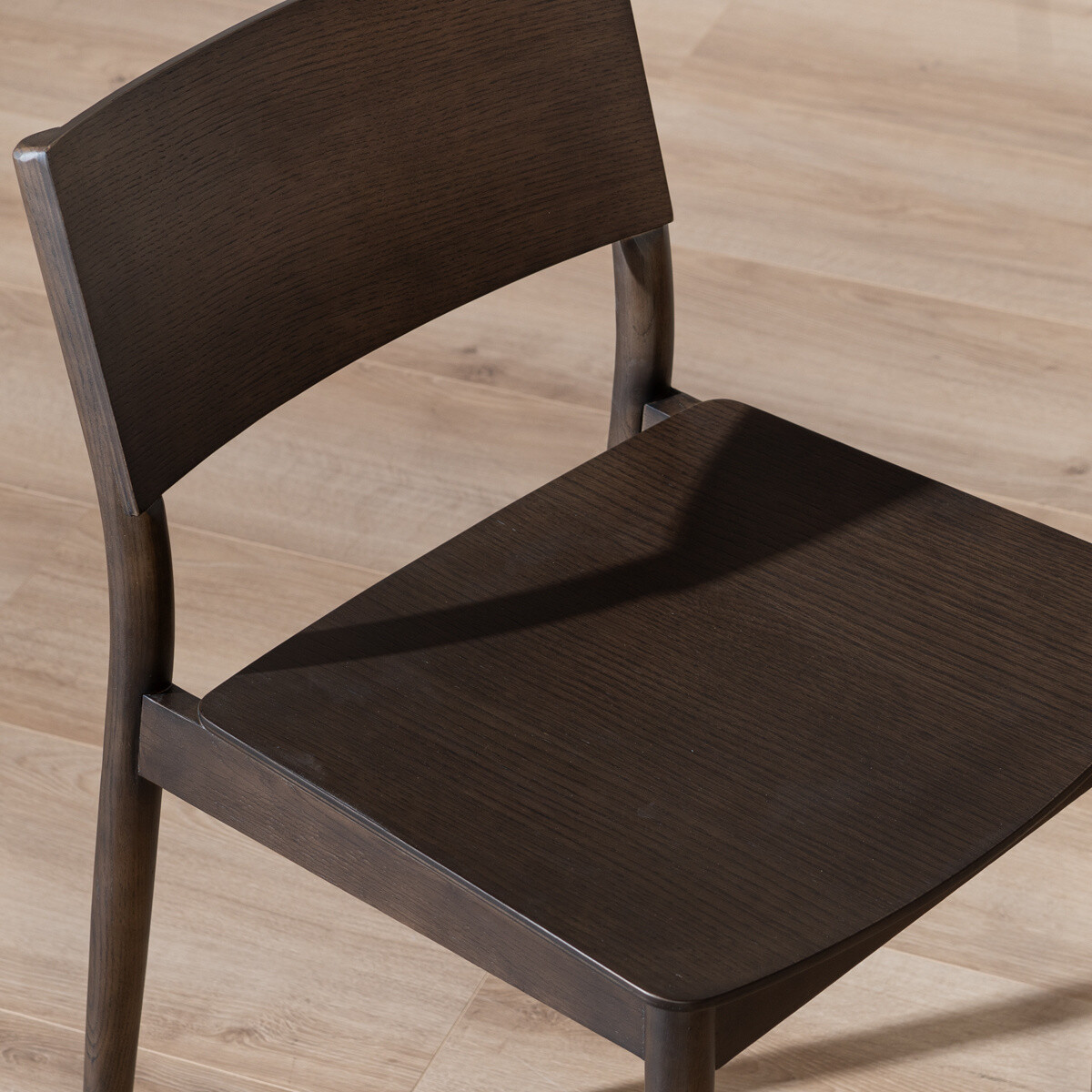 De stoel bevat een laag eikenfineer. Eikenfineer staalt warmte uit en is duurzaam. Eikenfineer is gevoelig voor krassen en deuken dus het is belangrijk om de eetkamerstoel goed te beschermen. Het is ook een goed idee om het meubel uit direct zonlicht te houden omdat dit de kleur van het fineer na verloop van tijd kan vervagen. Daarnaast is eikenfineer wel erg sterk, het buigt niet en trekt niet krom. De zitting en de rugleuning zijn gemaakt van multiplex met een laag fineer en het frame is gemaakt van 100% massief eiken.