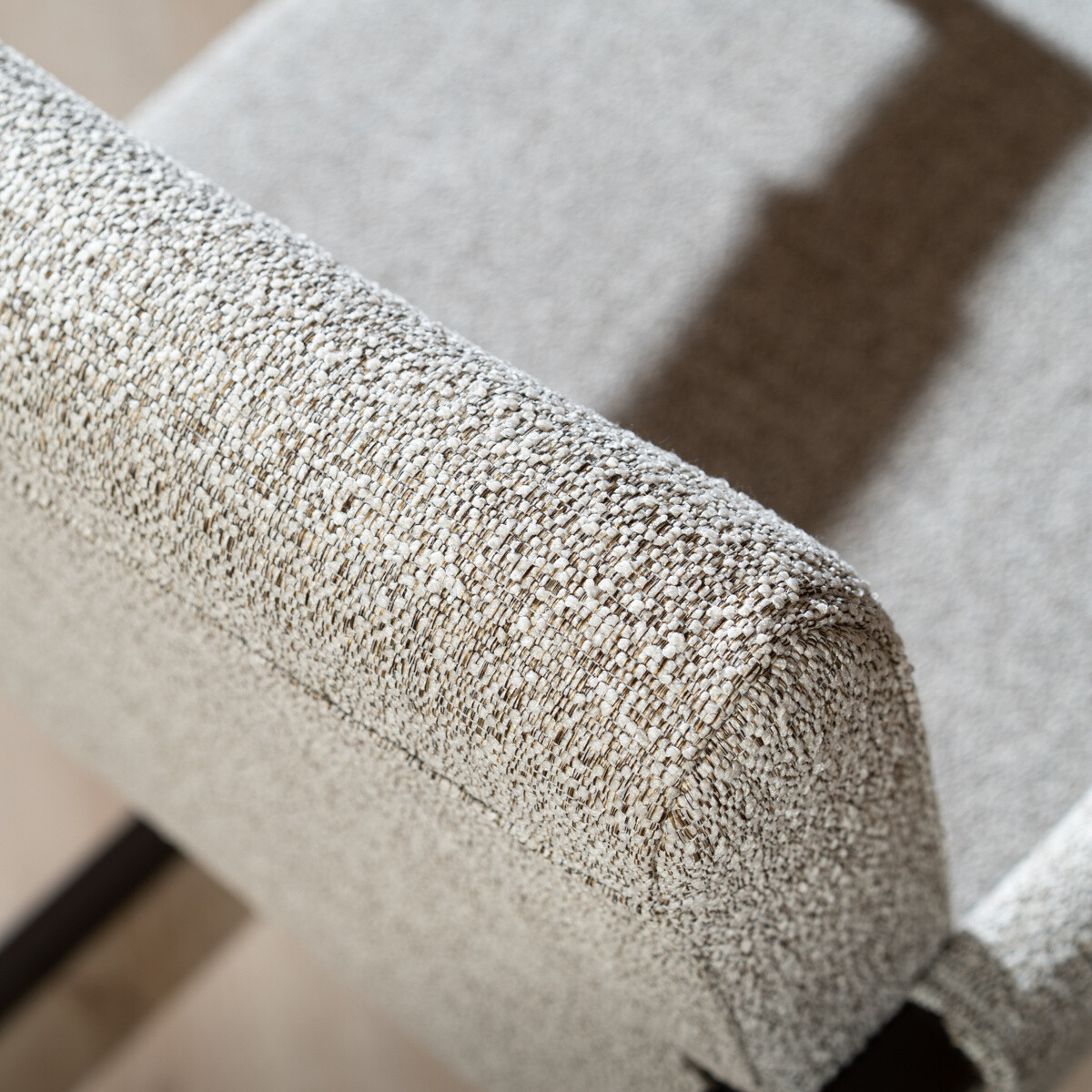 - De armleuning is gestoffeerd in dezelfde stof als de zitting.