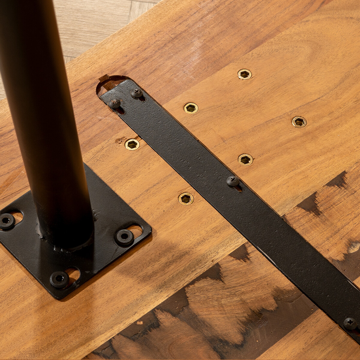Het onderstel van eetkamertafel Richy bestaat uit vier stevige metalen poten. Deze zijn op verschillende plekken van het tafelblad te monteren. Hierdoor kun je zelf kiezen wat een geschikte afstand is tussen de tafelpoten. Met de poten ver naar binnen gemonteerd ontstaat er ruimte voor een zitplek aan het hoofdeindes van de tafel. Door juist de poten ver naar buiten te plaatsen, optimaliseer je de ruimte aan de lange zijdes.