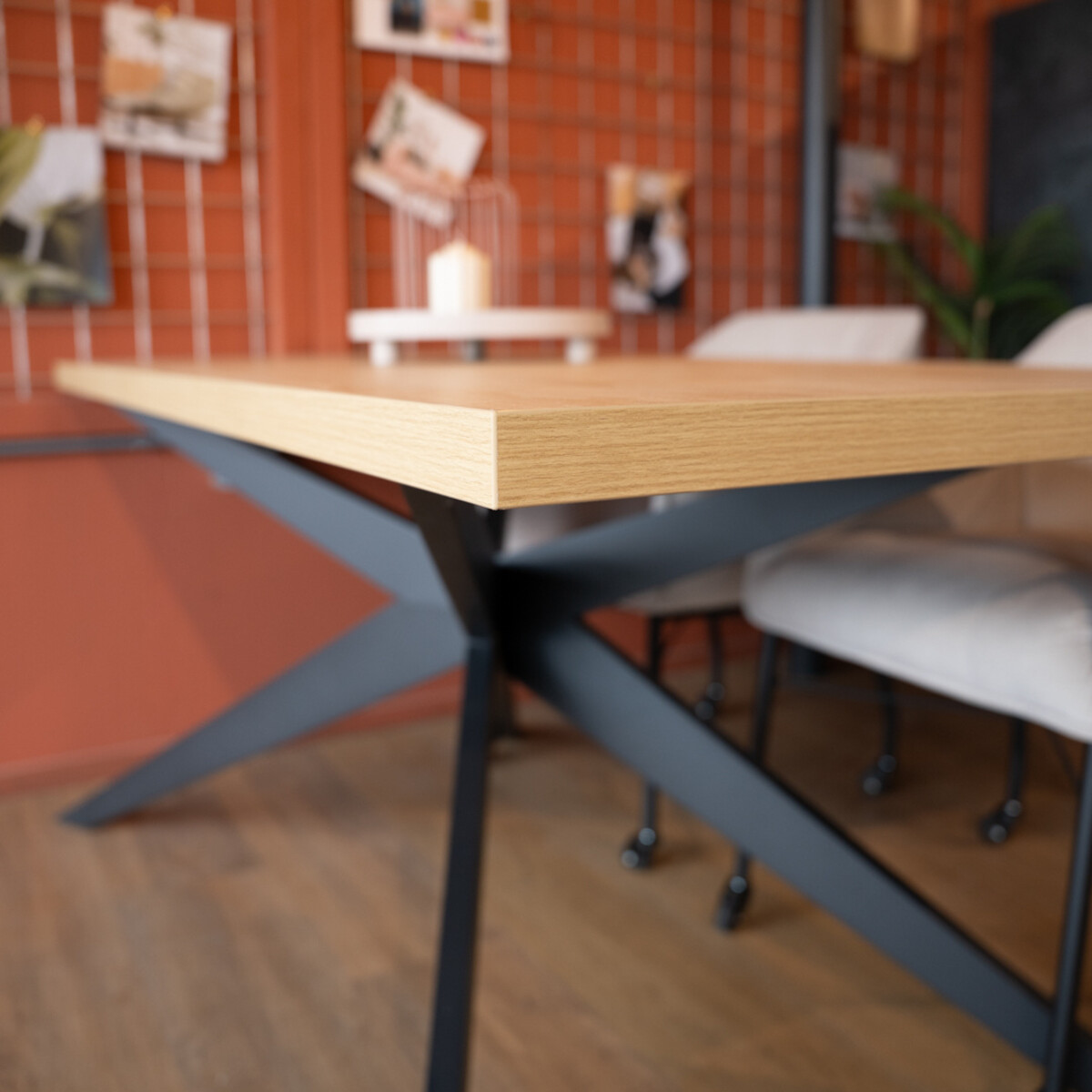 Het tafelblad heeft een rechthoekige afwerking en deze worden middels een kantenbandmethode afgewerkt. De dikte van het blad is 3,8 cm.