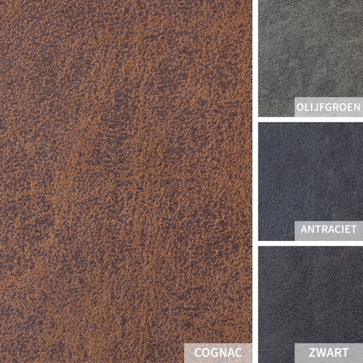 Barstoel Barrel is verkrijgbaar in de kleuren: cognac, zwart, olijfgroen en antraciet.