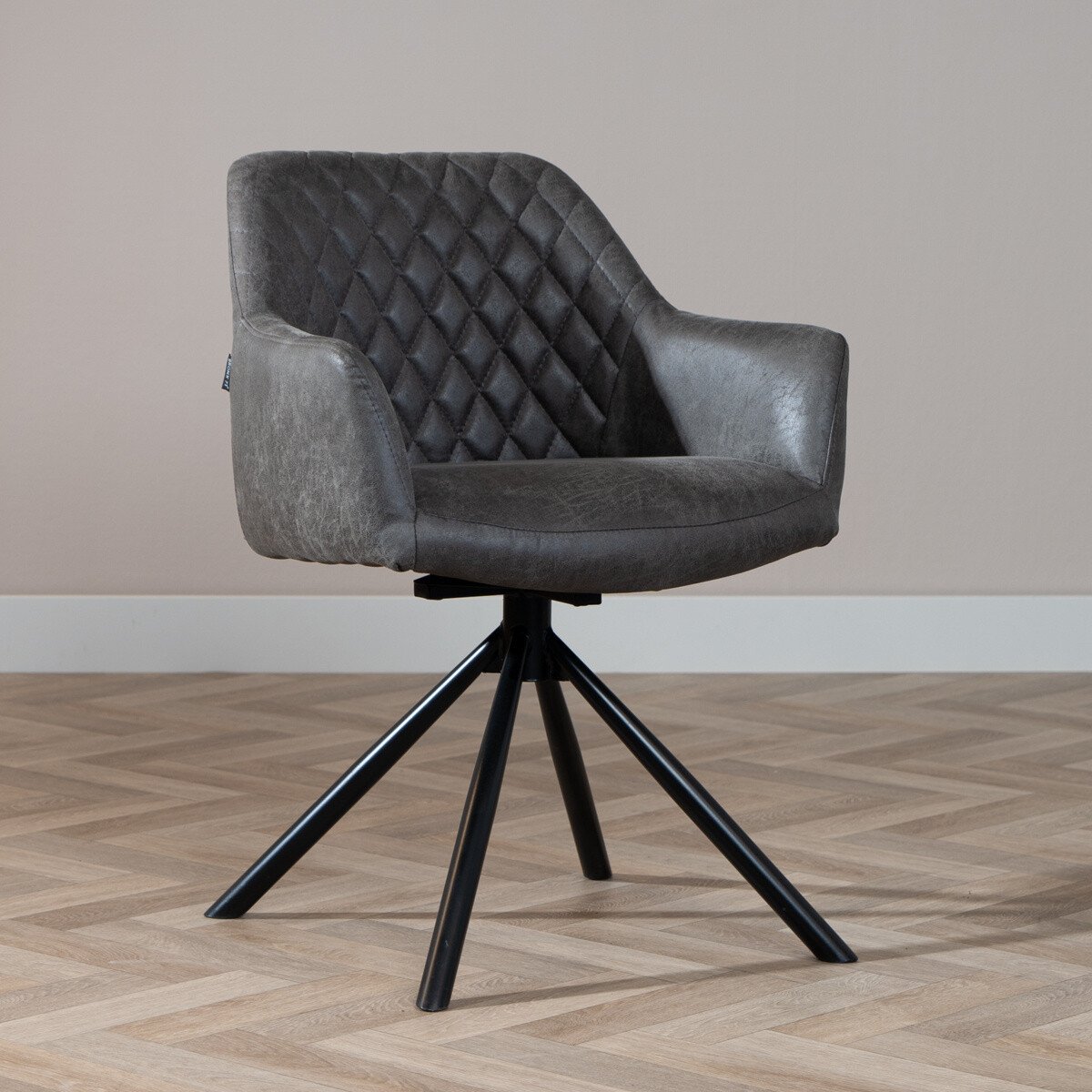 Industriële eetkamerstoel Dex heeft een stoer uiterlijk en past perfect in een industrieel interieur. Tevens past deze stoel door het strakke onderstel ook goed in een modern interieur! De zitting van de Dex is 180 graden draaibaar en zal altijd terugdraaien naar een rechte zit. Hierdoor staat de stoel altijd perfect aan de eetkamertafel! De zitting van eetkamerstoel Dex is afgewerkt met een mooi, diamantvormig patroon op de rugleuning. Hierdoor is het een echte eyecatcher. De zitting van de Dex is uitgevoerd in een antraciet kleur welke een warme bruine ondertoon heeft.