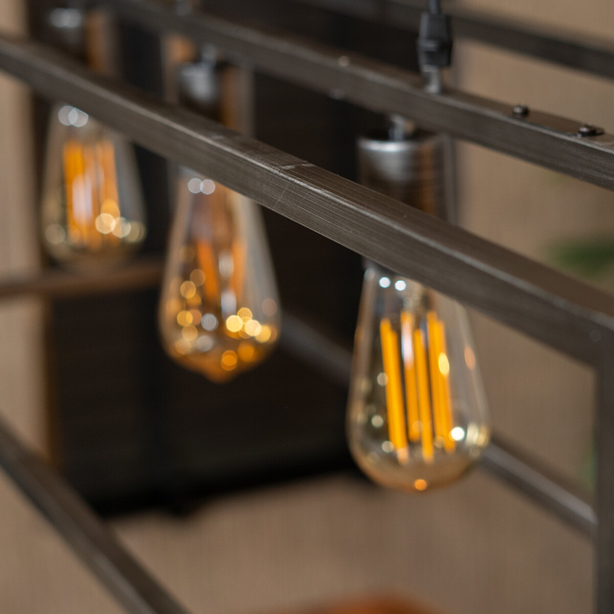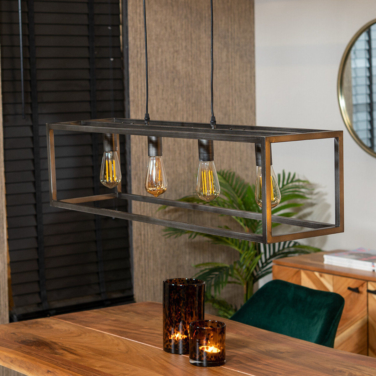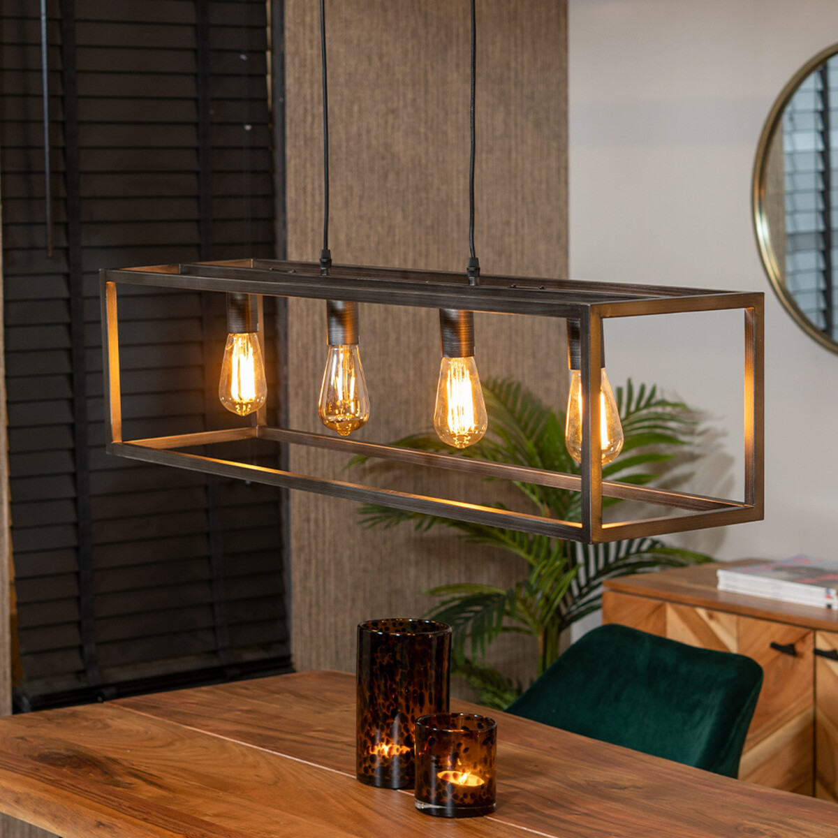 De hanglamp Brushed Cube 4-lichts is uitgevoerd in metaal met een donker grijze afwerking, dit geeft een mooie vintage uitstraling aan de hanglamp! Deze variant heeft een donkerdere afwerking dan zijn broertje die een oud zilveren afwerking heeft. De lichtbronnen hangen in één lijn in het frame, dit in combinatie met het rechthoekige design zorgen voor een strakke uitstraling. Het frame hangt door middel van twee stroomdraden aan één plafondbevestiging.
