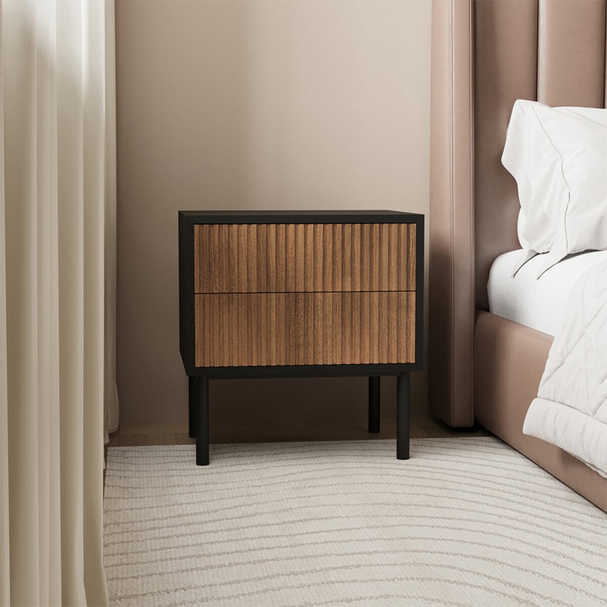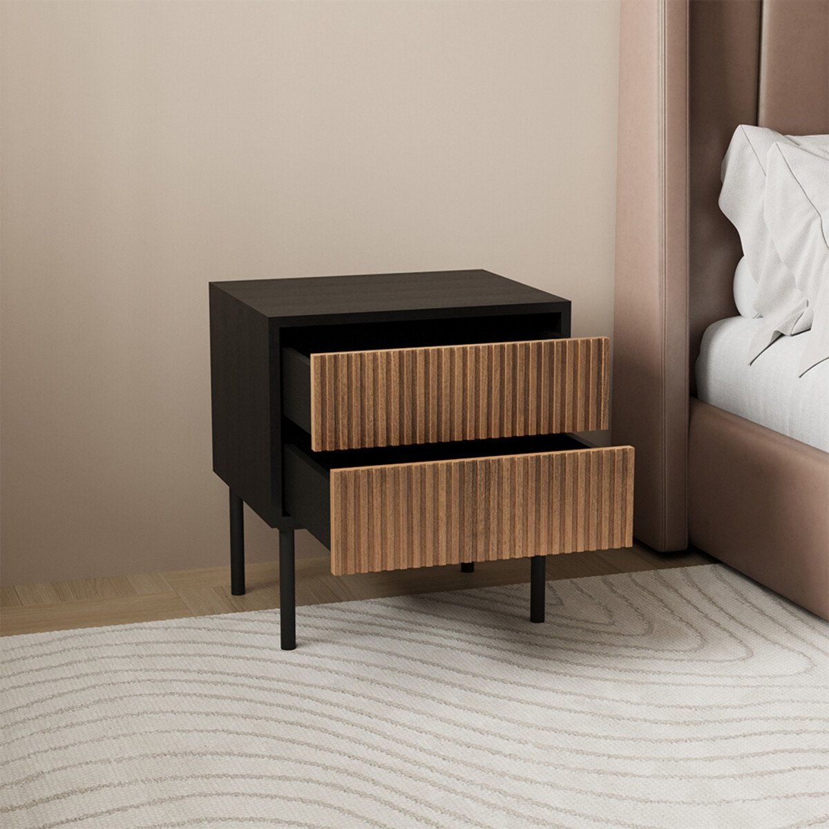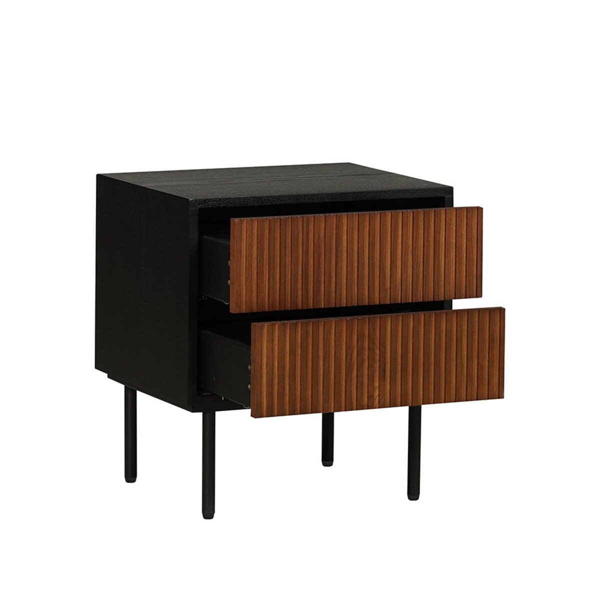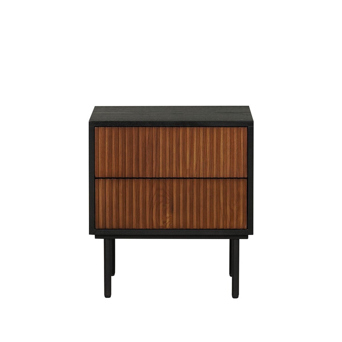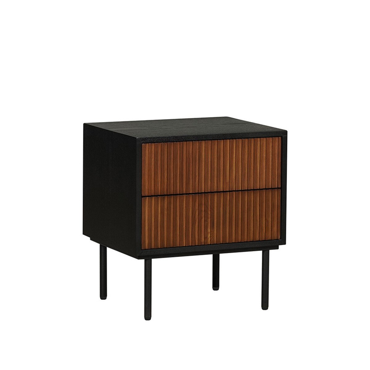 Je kunt het nachtkastje eenvoudig schoonmaken met een warme, lichtvochtige doek. De pootjes van het kastje zijn gemaakt van zwart gepoedercoat metaal. Het meubel is bij levering al volledig gemonteerd, maar het onderstel met de poten dien je nog wel zelf onder het meubel te bevestigen.
