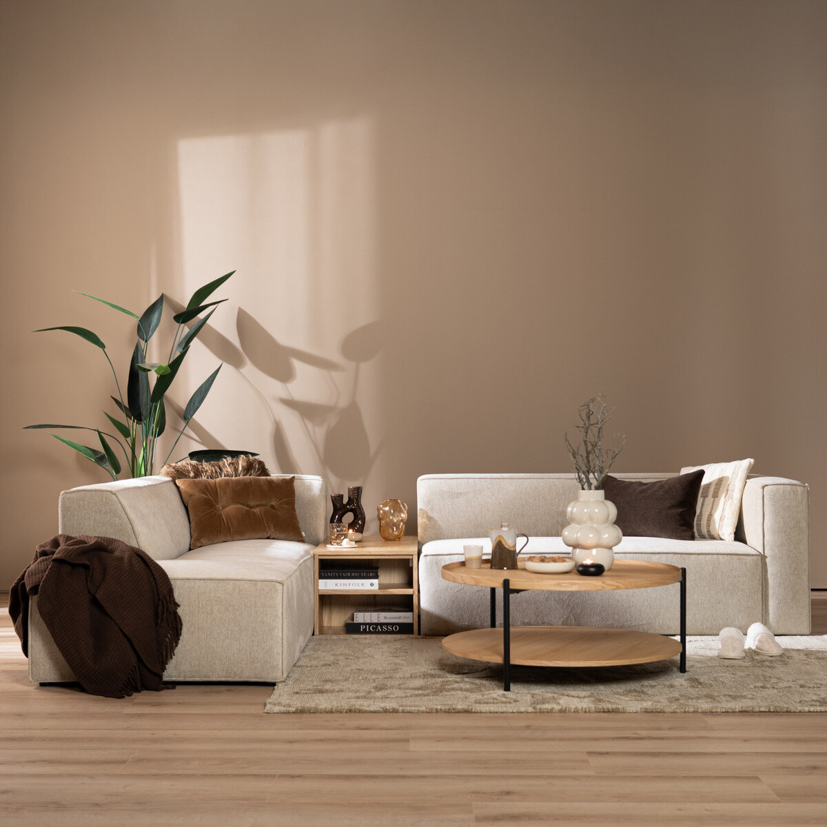 De sidetable is gemaakt van MDF met een eikenfineer laag. MDF is een plaatmateriaal dat wordt gemaakt door houtvezels onder hoge druk samen te persen met behulp van een lijm of hars. Het materiaal wordt vervolgens verwarmd en samengeperst tot een dichte, stevige plaat. De laag eikenfineer waarmee het meubel is afgewerkt, geeft de bank tafel een robuuste uitstraling. Eikenfineer is niet van massief hout te onderscheiden en trekt niet tot nauwelijks krom.