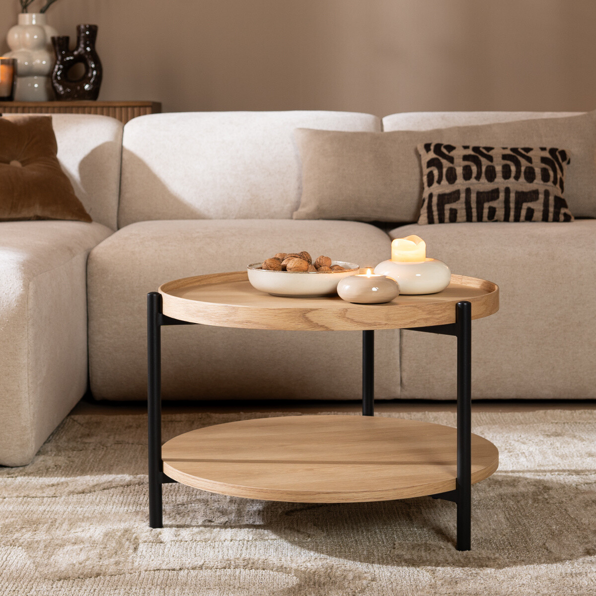 Salontafel Rio is een elegante toevoeging aan jouw woonkamer. Het moderne design met een diameter van 58 cm en een blank eikenhouten fineer laag straalt stijl en klasse uit. Deze salontafel heeft een uniek ontwerp met twee bladen die onder elkaar zijn geplaatst, waardoor je extra ruimte hebt om tijdschriften, afstandsbedieningen en decoratieve items op te bergen.
