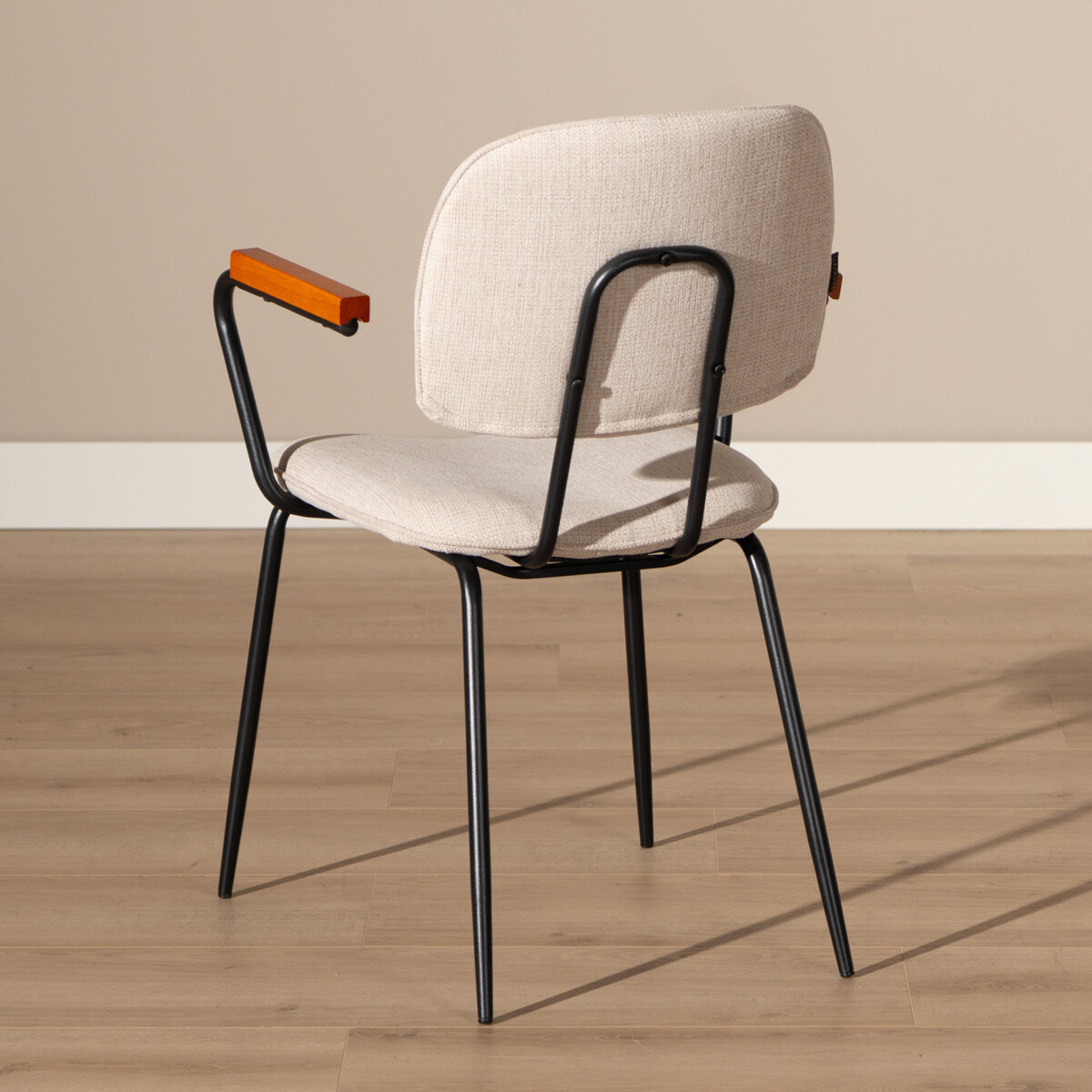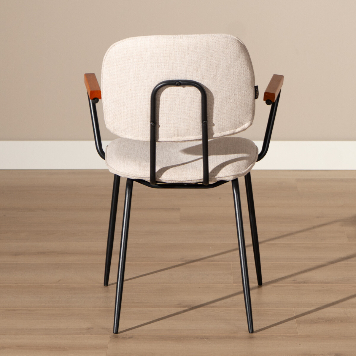 Het frame van de Oskar eetkamerstoel is gemaakt van gepoedercoat metaal met een zwarte afwerking. De stoel heeft comfortabele armleuningen welke zijn voorzien van een houten steun gemaakt van rubberhout.