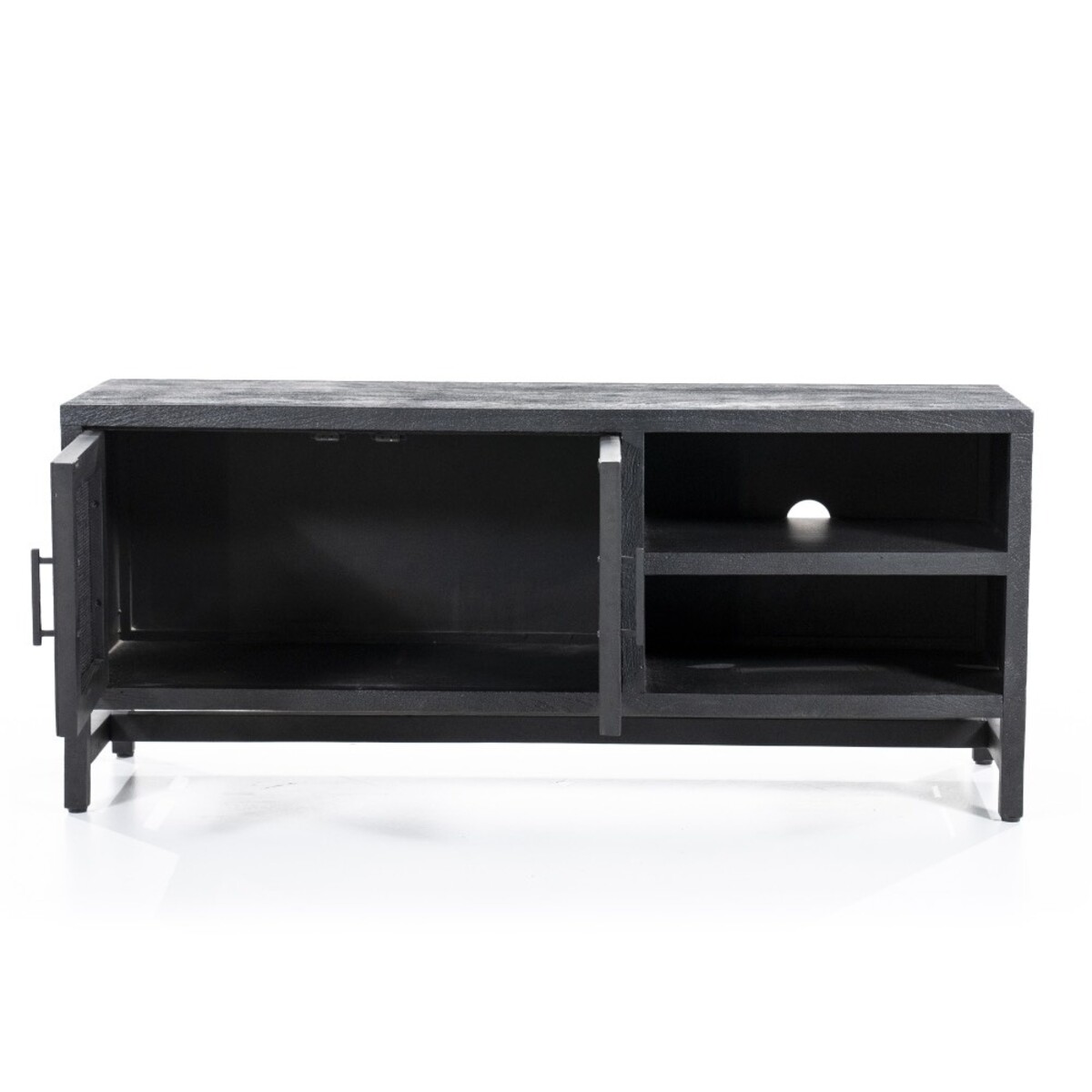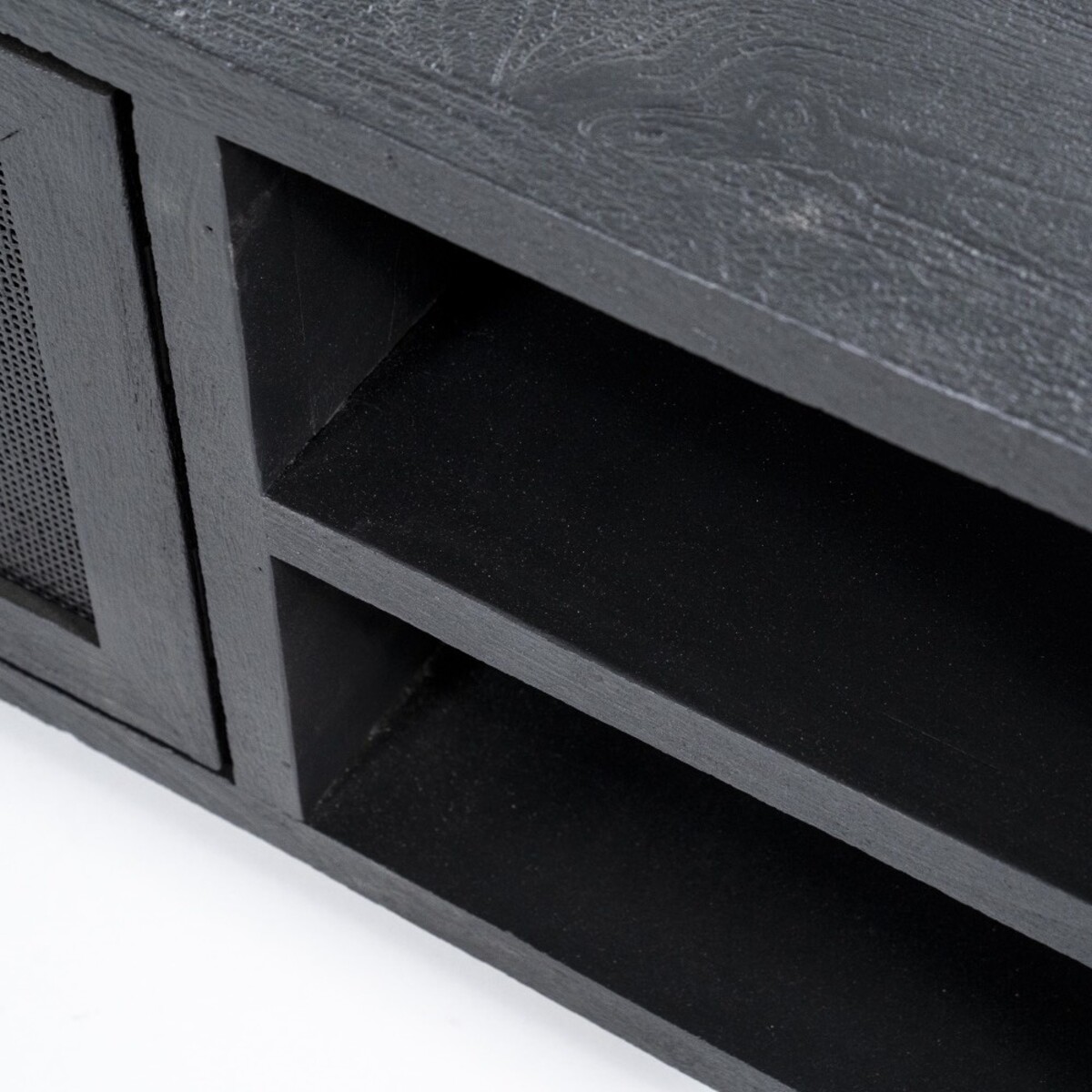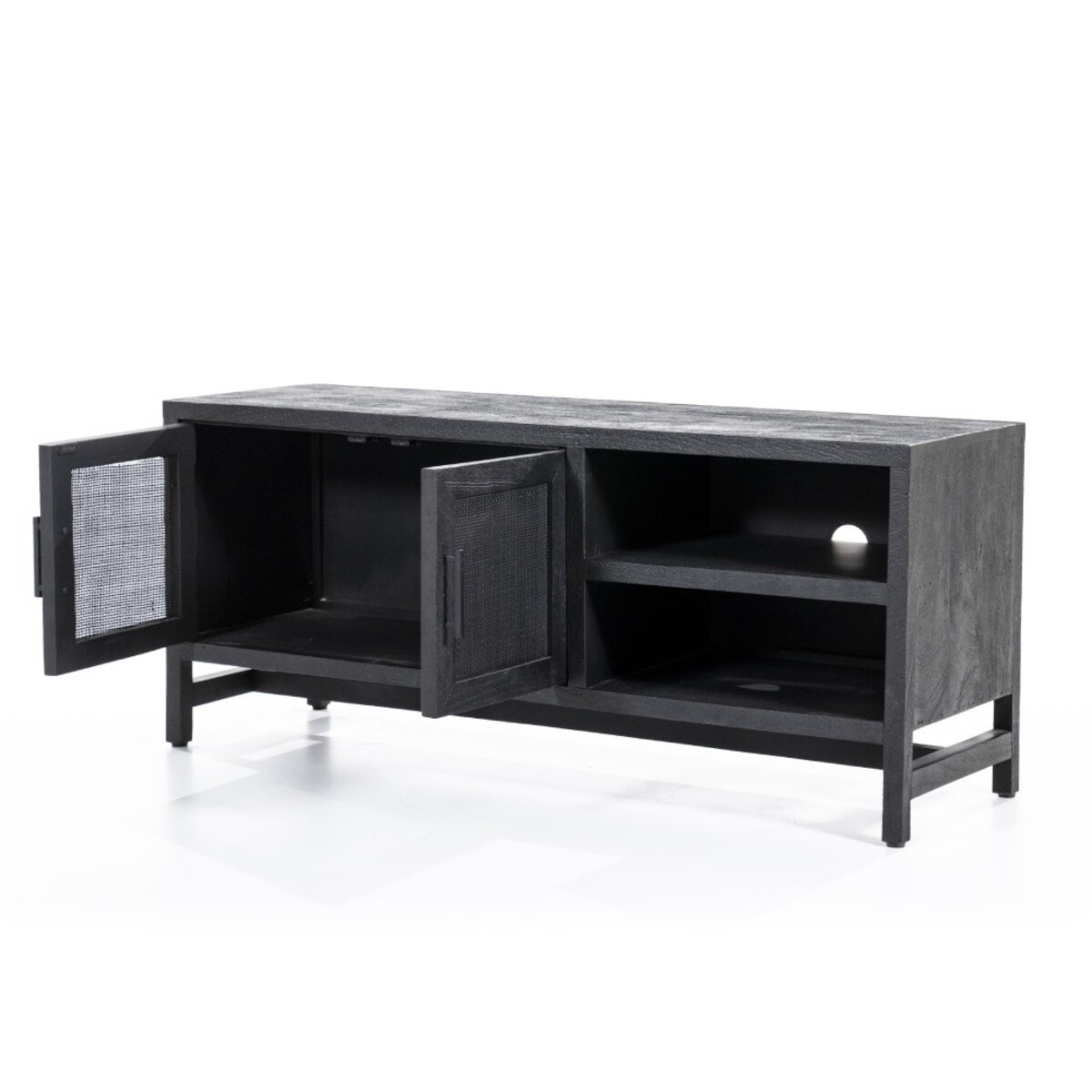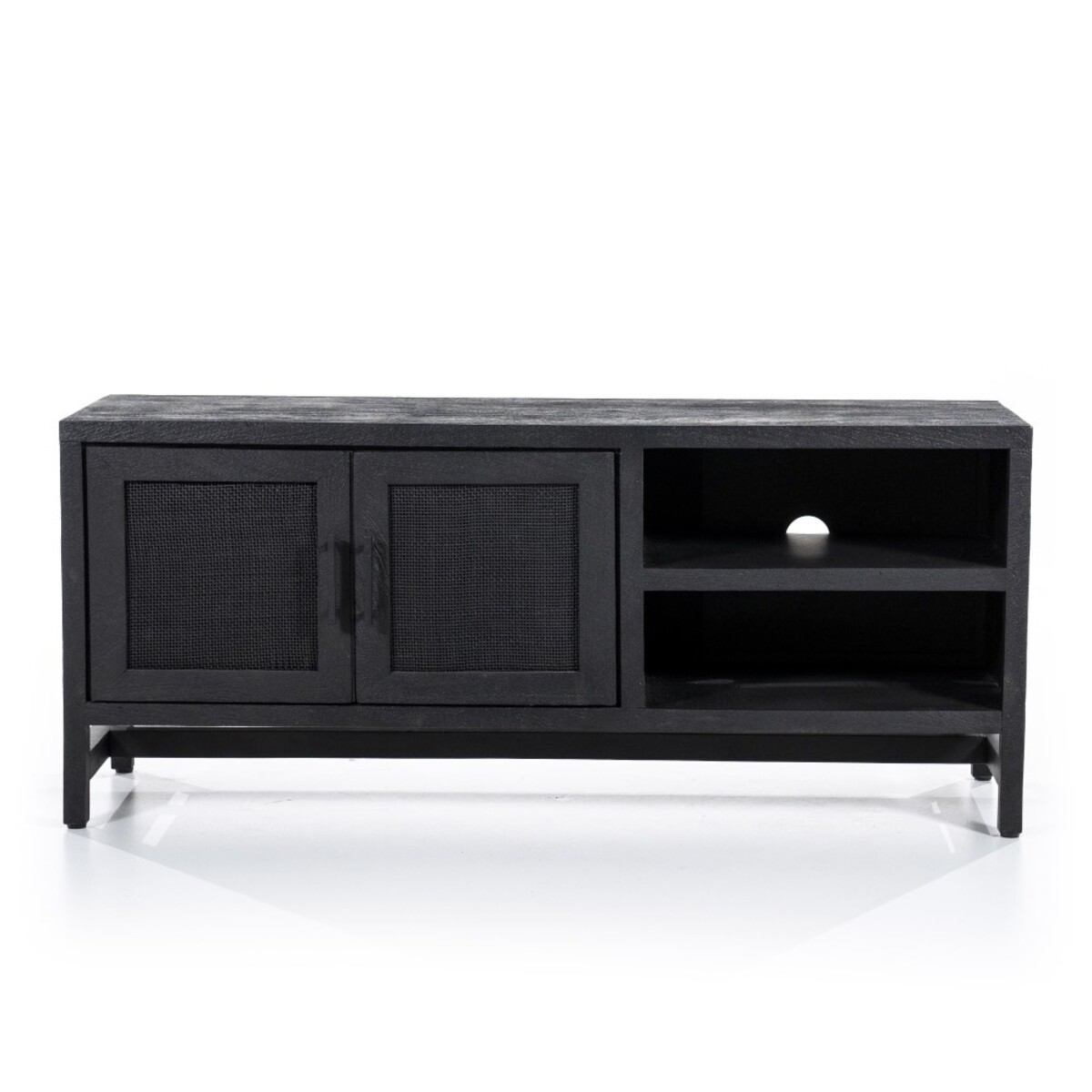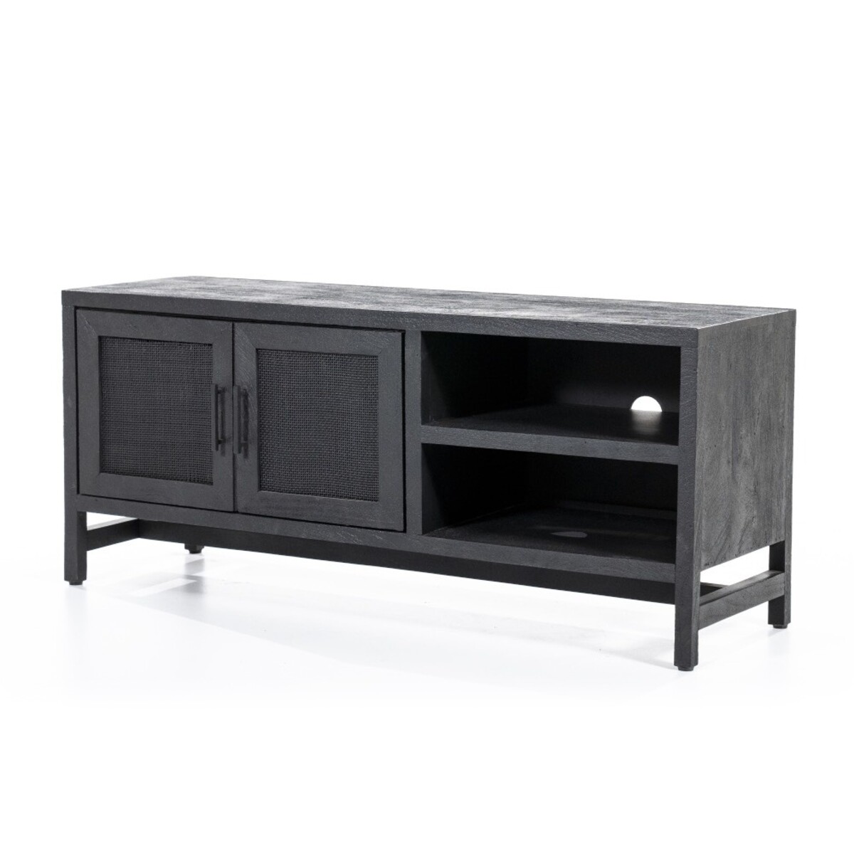 Geef jouw huiskamer een stoere uitstraling met het zwarte mangohouten tv-meubel Fresno! Dit unieke exemplaar met twee webbing klepdeurtjes en twee legplanken geeft een vintage touch aan jouw interieur. Deze bijzondere tv-kast past goed in vrijwel elke interieurstijl.
