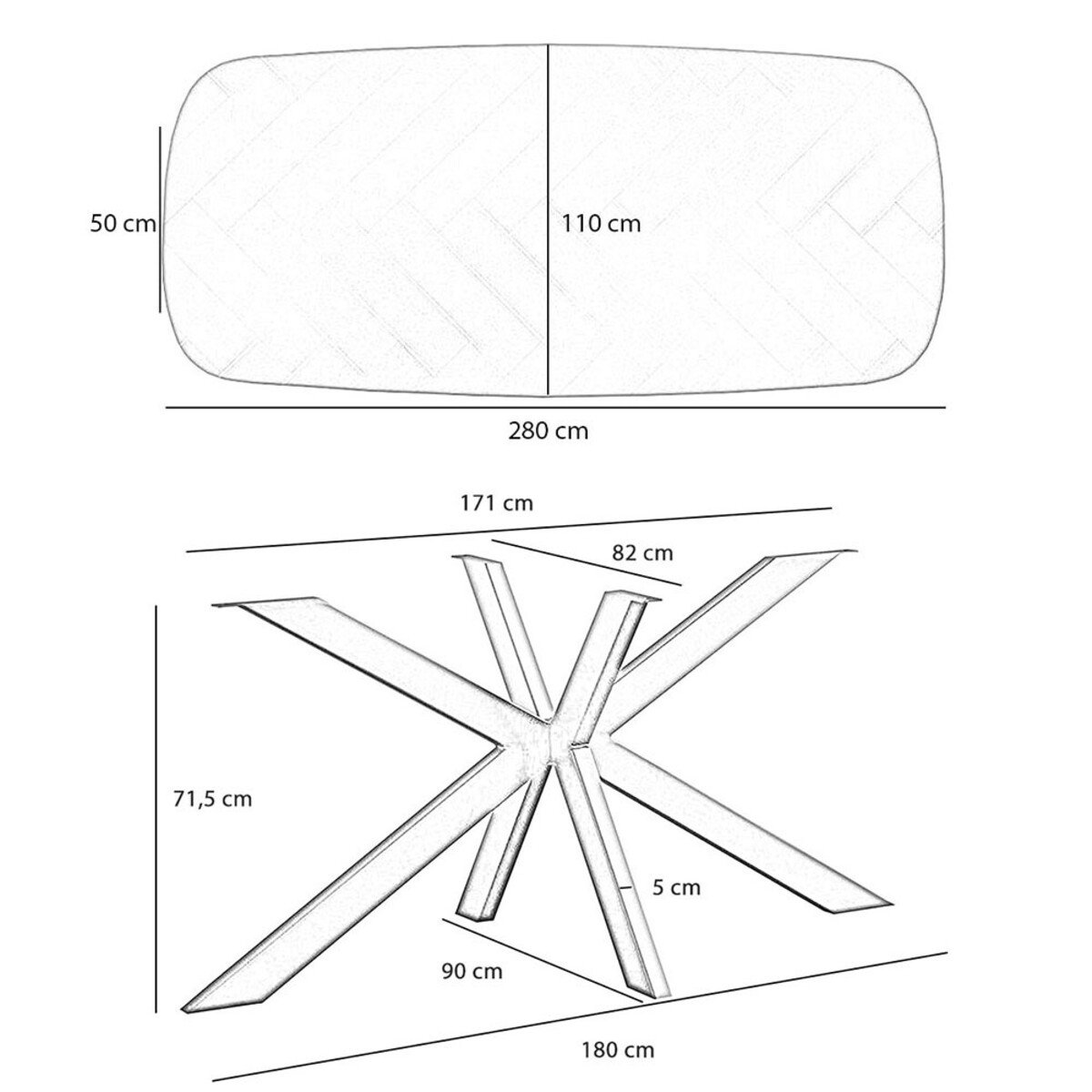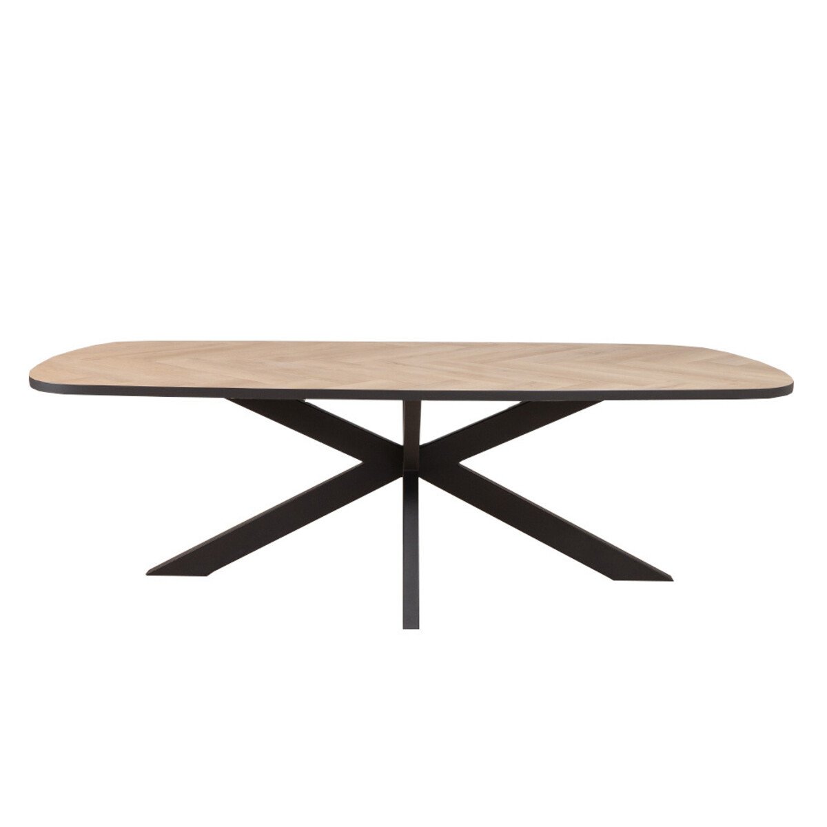 Eettafel visgraat ovaal Haley heeft een gepoedercoat, metalen spinpoot als onderstel. Het onderstel zorgt voor veel stabiliteit waardoor de tafel stevig op zijn poten staat. Het onderstel heeft wat dikkere balken wat voor een robuustere uitstraling zorgt. De totale hoogte van de tafel is 74 centimeter. De hoogte tot aan de onderkant van het tafelblad is 71 centimeter.